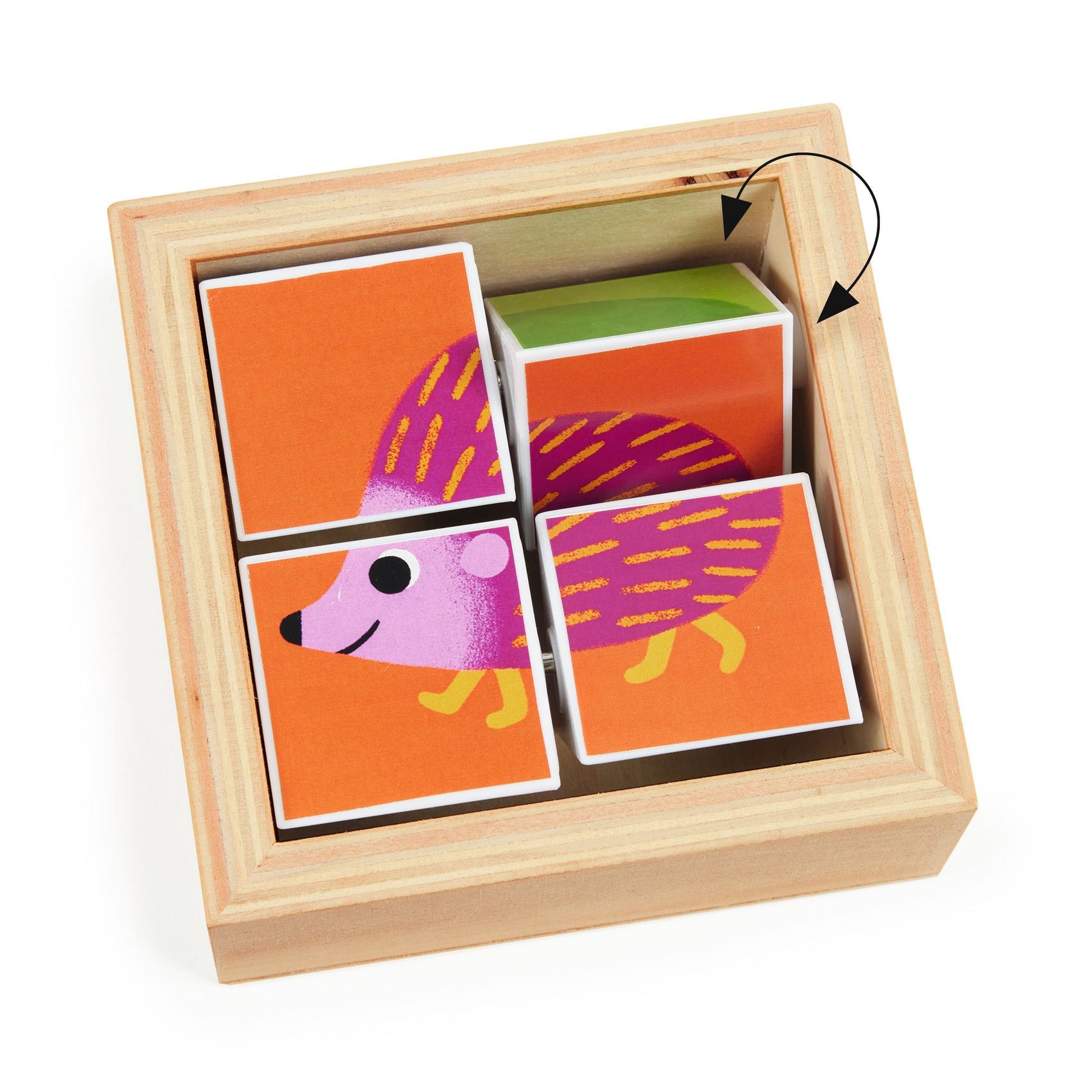 Tournibist is een grappige puzzel in een houten kader! Liggend op tafel draait het kind aan de 4 draaibare vormen om een van de 3 dieren te maken: de egel, de muis of de schildpad, of om fantastische fantasiedieren te creëren.