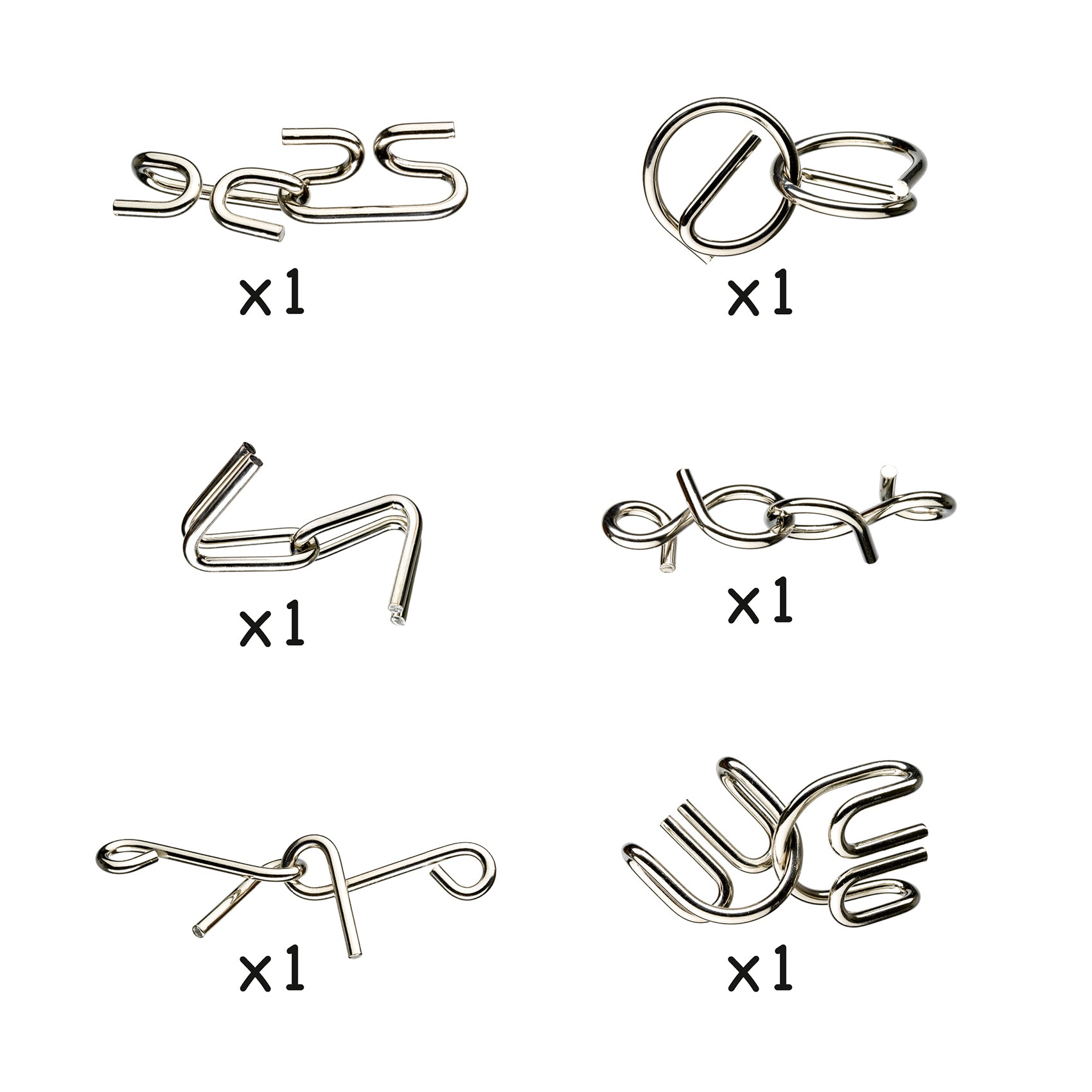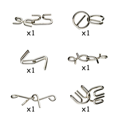 Een uitdagend spel vol geduld: 6 prachtige metalen puzzels die je hersenen flink aan het werk zetten!Het doel? De twee metalen stukken van elkaar losmaken – zonder kracht te gebruiken...