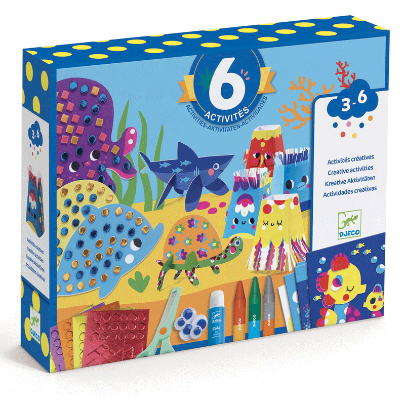 Hier is een zeer complete doos met 6 creatieve activiteiten en vele projecten rond het thema van de zee: collage, kleuren, mozaïeken, snijden, assembleren, transfers. Er is voor elk wat wils!