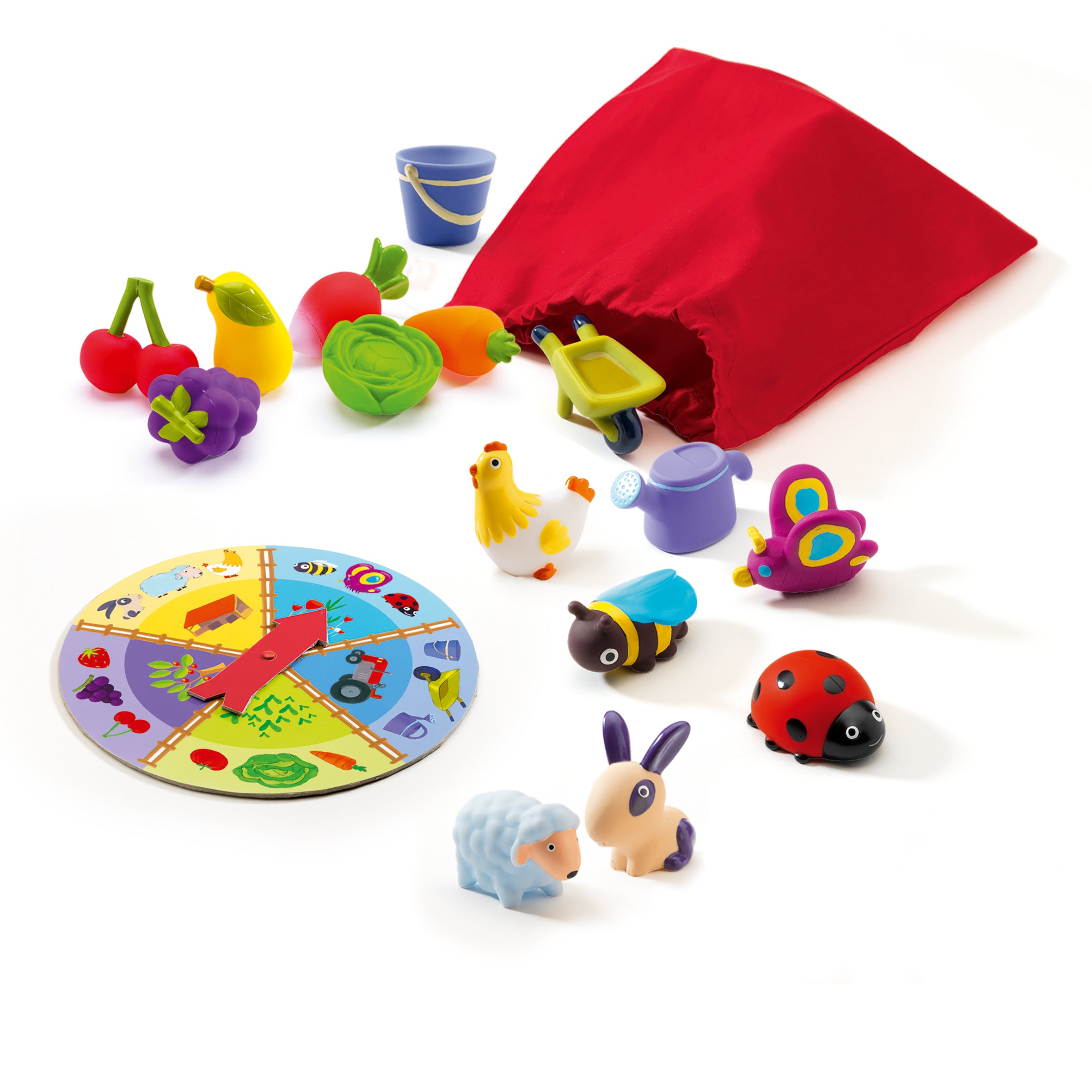 Er zijn 18 figuren (groenten/fruit/dieren/voorwerpen op de boerderij/insecten) in dit spel en 1 draairad. Draai aan het wiel en steek je hand in de tas om een figuurtje te vinden dat werd aangegeven door de pijl!