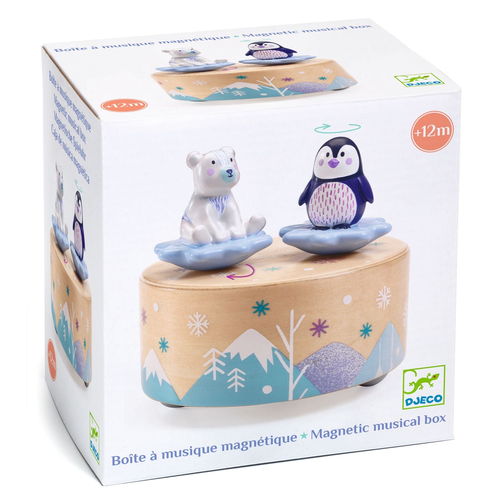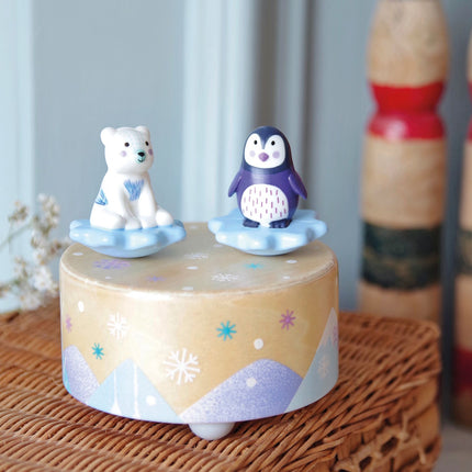 Ice Park Melody is een ronde, magnetische muziekdoos, prachtig geïllustreerd met twee schattige figuurtjes: een beer en een pinguïn.
