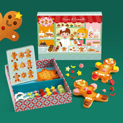 Oscar en Cannelle is een mooi doosje met drie kleine peperkoekjes, twee figuurtjes en een ster, die je kunt versieren volgens de voorbeelden op de kaart of helemaal naar eigen fantasie.