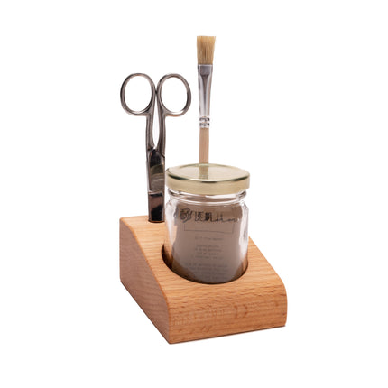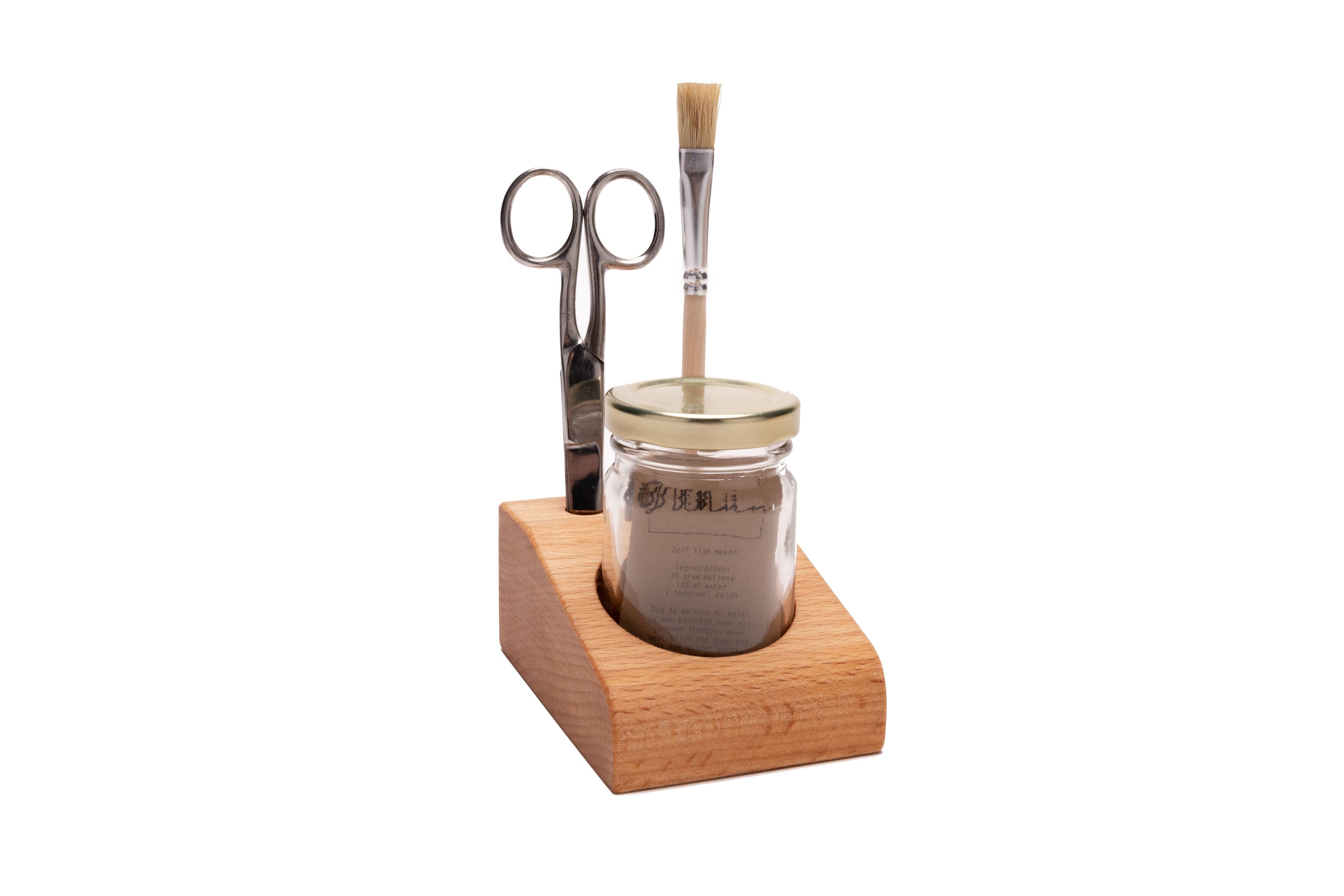 Je lijm en kwast samen in één houder. Elke lijmsetje is met de hand gemaakt van massief beukenhout. De unieke houtnerven zullen per stuk verschillen. Wij geloven dat dit de ware schoonheid en het karakter van het natuurlijk hout laat zien. De lijmpot houder wordt geleverd met een glazen potje met deksel , één Grennn kwast en één schaartje.