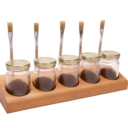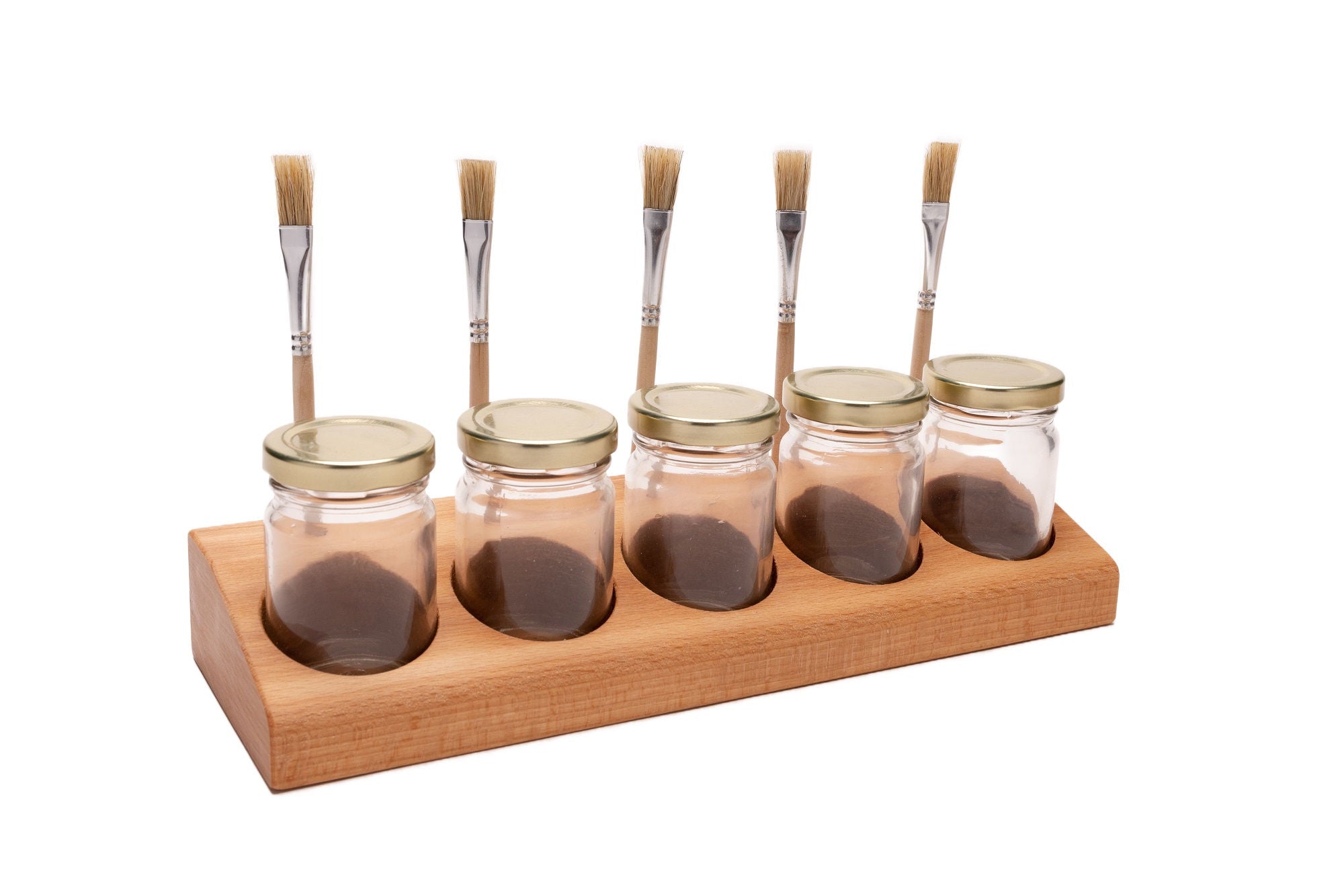 Je verf en kwasten samen in één houder. Elke verfpot houder is met de hand gemaakt van massief beukenhout. De unieke houtnerven zullen per stuk verschillen. Wij geloven dat dit de ware schoonheid en het karakter van het natuurlijk hout laat zien. De verfpot houder wordt geleverd met vijf glazen potjes met deksel en vijf Grennn kwastjes.