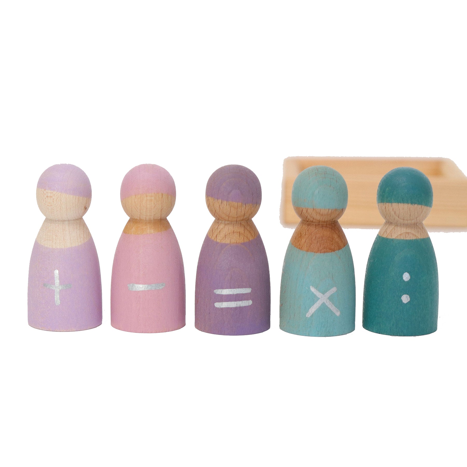 Elke rekenvriend is versierd met een rekensymbool: optellen, aftrekken, vermenigvuldigen en delen. De vijfde rekenvriend is versierd met het gelijk-aan teken en verheugt zich op spelenderwijs begrijpelijke antwoorden.