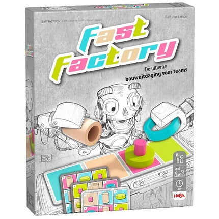 In dit spel kruip je in de rol van ambitieuze montagerobots in een fabriek, maar zijn jullie ook even snel en secuur? In Fast Factory speel je in 2 teams, waarbij het snelste team de ronde wint. De regels zijn erg simpel, maar de uitdagingen zijn dat zeker niet. Elke ronde krijgen beide teams een kaart met handelingen die ze moeten volgen. De 4 houten onderdelen moet je draaien, verplaatsen, stapelen en inbedden. Het team wat dat het snelst doet zonder een fout te maken wint de ronde. Hoe je dat voor elkaar krijgt? Met een rustige hand, stalen zenuwen, snelheid en natuurlijk heel veel teamwerk. Het spel is geschikt voor 8 jaar en ouder, en daarmee een zeer leuk spel om als familie te spelen. Een goede manier om er achter te komen wie er een koel hoofd weet te behouden in de chaos!