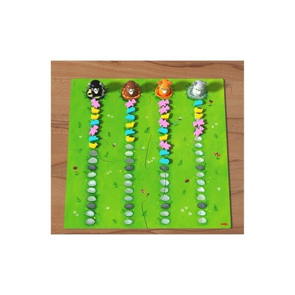Tapsi, Flo, Tine en Flocke gaan heerlijk in de tuin spelen! De puppy's en kittens spelen haasje over, en iedere keer als ze iemand passeren, dan verdienen ze daar een speeltje mee. Rol met de dobbelsteen, en verplaats jouw puppy of kitten naar het eerstvolgende vakje met de zelfde kleur. Ga je voorbij een van de andere spelers? Dan mag je een speeltje van de stapel pakken en in je mandje leggen. Als alle speeltje verdeeld zijn, dan kun je het bord omdraaien en de speeltjes voor de mandjes uitstallen, zodat je (zonder te tellen) gemakkelijk kunt zien wie de meeste speeltjes heeft verzameld en heeft gewonnen!
