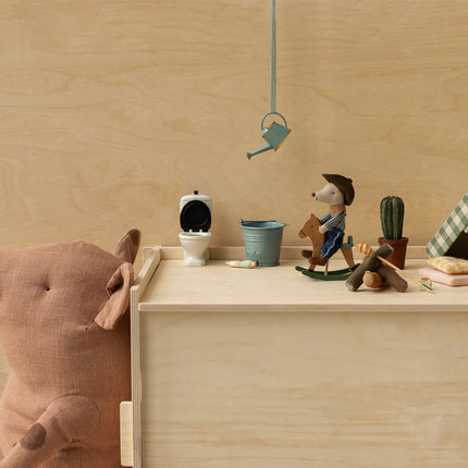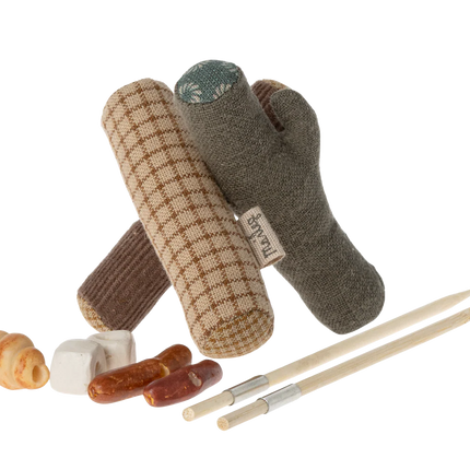 Wanneer de wandelende muizen op avontuur zijn, zitten ze graag bij het kampvuur om hun eten klaar te maken. Deze set wordt geleverd met stokjes, voedsel en takken. De stokjes hebben een klein metalen deel zodat de wandelmuizen ze met hun magnetische pootjes kunnen vasthouden.