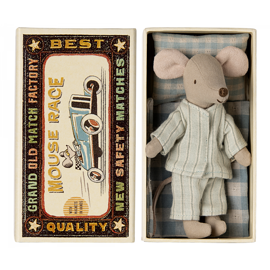 Deze lieve Maileg muis, formaat grote broer, draagt een schattige pyjama en heeft heerlijk zacht beddengoed in zijn luciferdoosje.