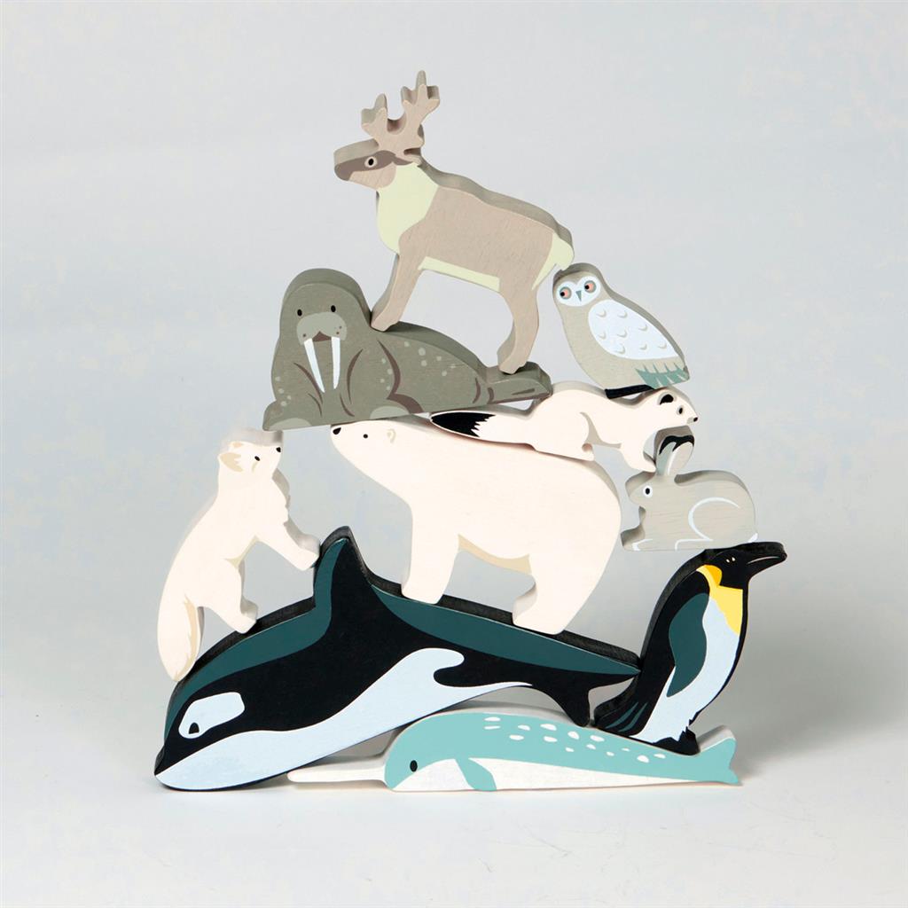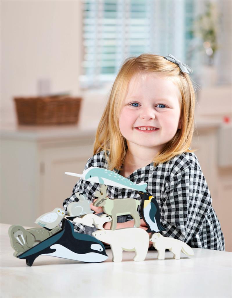 Inhoud van deze set: een orka, narwal, sneeuwhaas, poolvos, koningspinguïn, uil, witte hermelijn, walrus, een eland en natuurlijk een ijsbeer.
