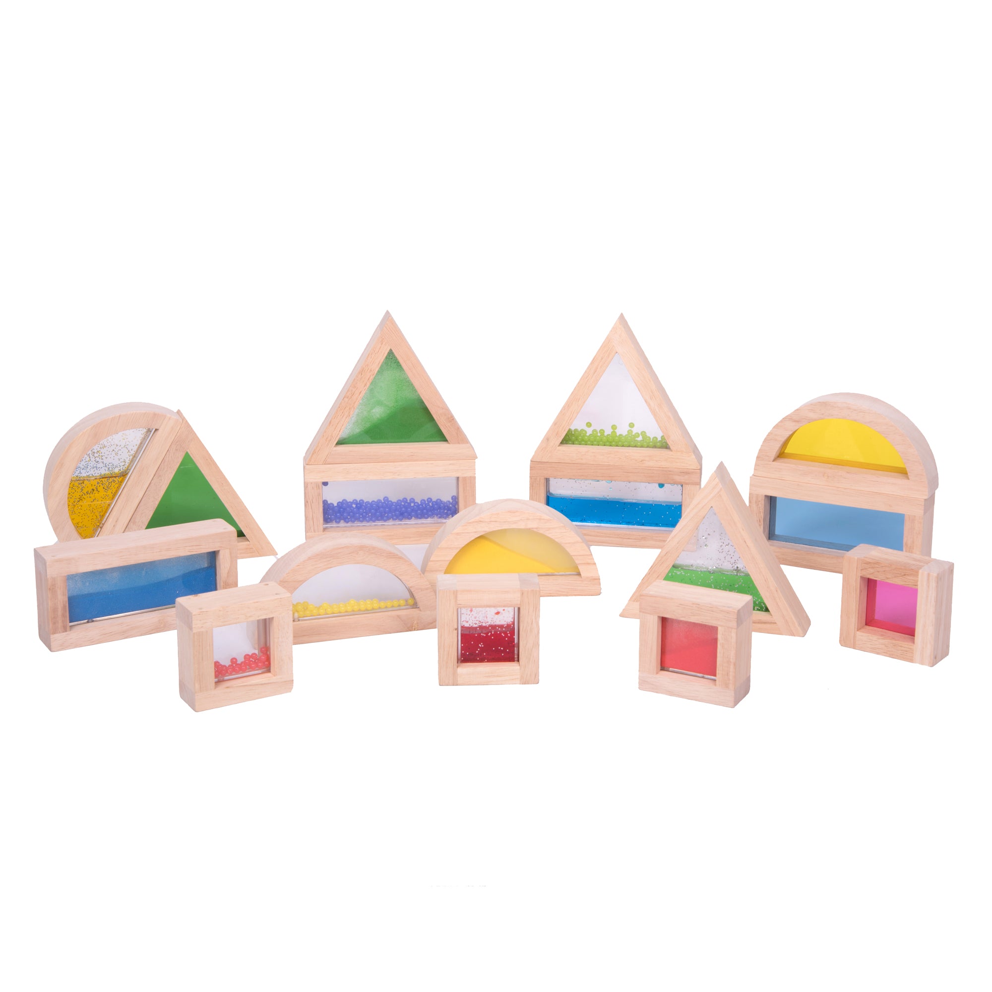 16 grote blokken rubberhout met kralen, transparant acryl, gekleurd zand en met water / glitter gevuld in 4 verschillende vormen (vierkant, rechthoek, driehoek en halve cirkel). De sensorische blokken bevorderen observatie in bredere zin, omdat alle vormen dezelfde kleur- en vormconventie volgen. Dus, ongeacht de inhoud van het blok, zijn de driehoeken altijd groen. De combinatie van gladde houten buitenkant en het felgekleurde sensorische centrum vormt een fascinerende component met een veelvoud aan educatieve mogelijkheden voor gebruik bij kinderen van alle leeftijden.