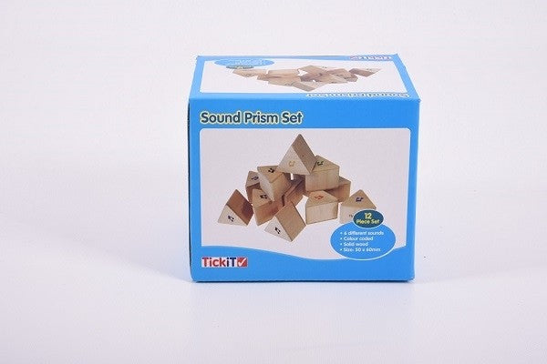 Deze set geluidsblokken bevat 6 paar prachtige hardhouten driehoekige prisma's, herkenbaar aan kleurgecodeerde muzieknoten.
