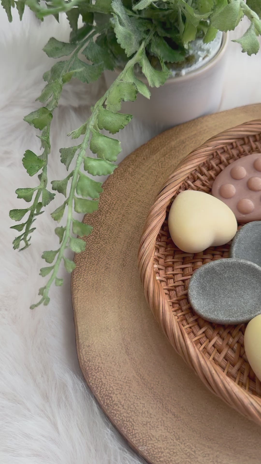 Elke set bevat twaalf stenen: vier van elk van de drie ontwerpen (hartvormig, hobbelig en uitgehold). Afmeting: 60–75 mm. Geschikt vanaf 3 jaar.