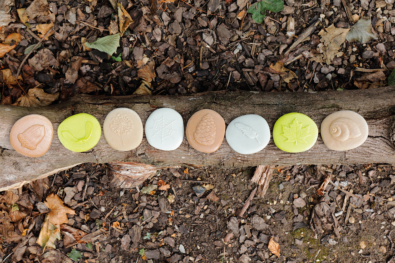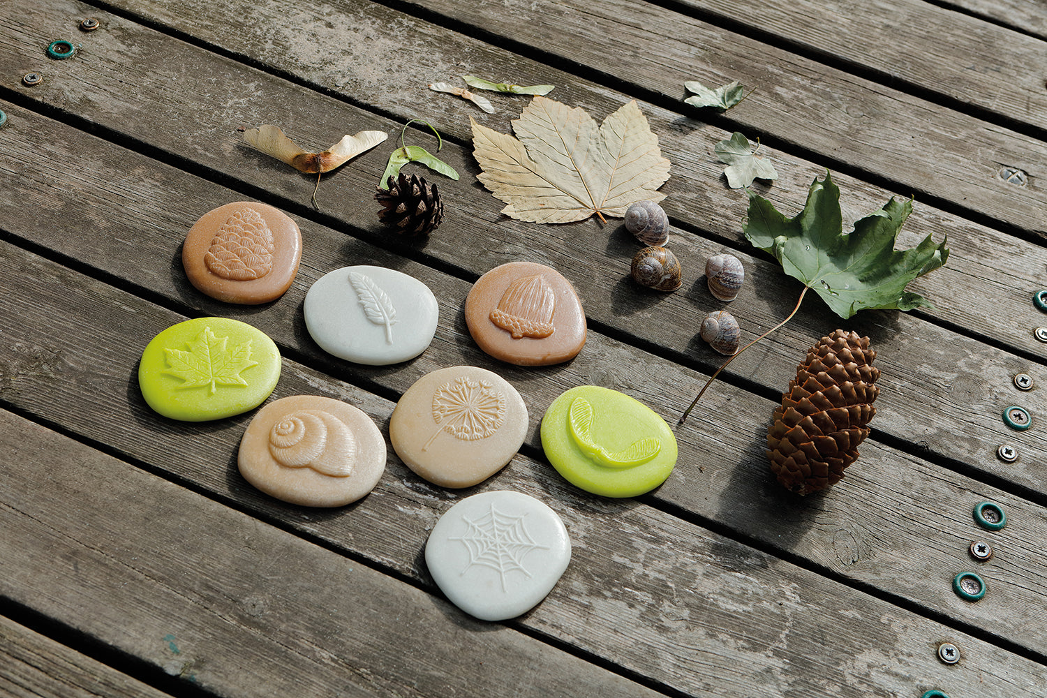 Set bevat acht stenen: eikel, paardebloemkop, veer, dennenappel, slakkenhuis, spinnenweb, plataanblad, plataanzaden.